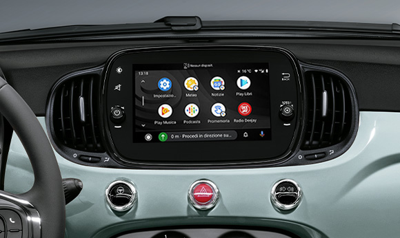 500 un 500C ir saderīgi ar Android Auto™ sistēmu. Pievienojiet viedtālruni un pārvaldiet kartes, mūziku, kontaktus un daudz ko citu, neapdraudot drošību. Pateicoties lietotājam draudzīgajam interfeisam, jūsu lietojumprogrammas tiek parādītas 7 collu Uconnect™ HD ekrānā. Pieejams kā aksesuārs.