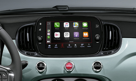 500% smieklīgi. Fiat 500 un 500C hibrīda informācijas un izklaides sistēma ir aprīkota ar UconnectTM 7" skārienekrāna DAB radio un vadības ierīcēm uz stūres. Pateicoties Bluetooth® funkcijai, rokas ir brīvas braukšanai, vienlaikus skatoties uz priekšā esošo ceļu.